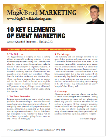 10 Key Elements of Event Marketing This document outlines the 10 key actions for a successful Event Marketing Campaign. Goals, Pre-Event, Message, Booth Graphics, Product, Service, Qualifying, Know the Show, Follow Up, Evaluation, Improvement and More!