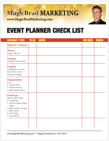 Event Planner Check List Event Planners, are by nature, very “Detail Oriented” people. We all make mistakes, but in the Event Business, just one missing detail can result in a HUGE event disaster. Remember to cross the “T”s, dot the “I”s.